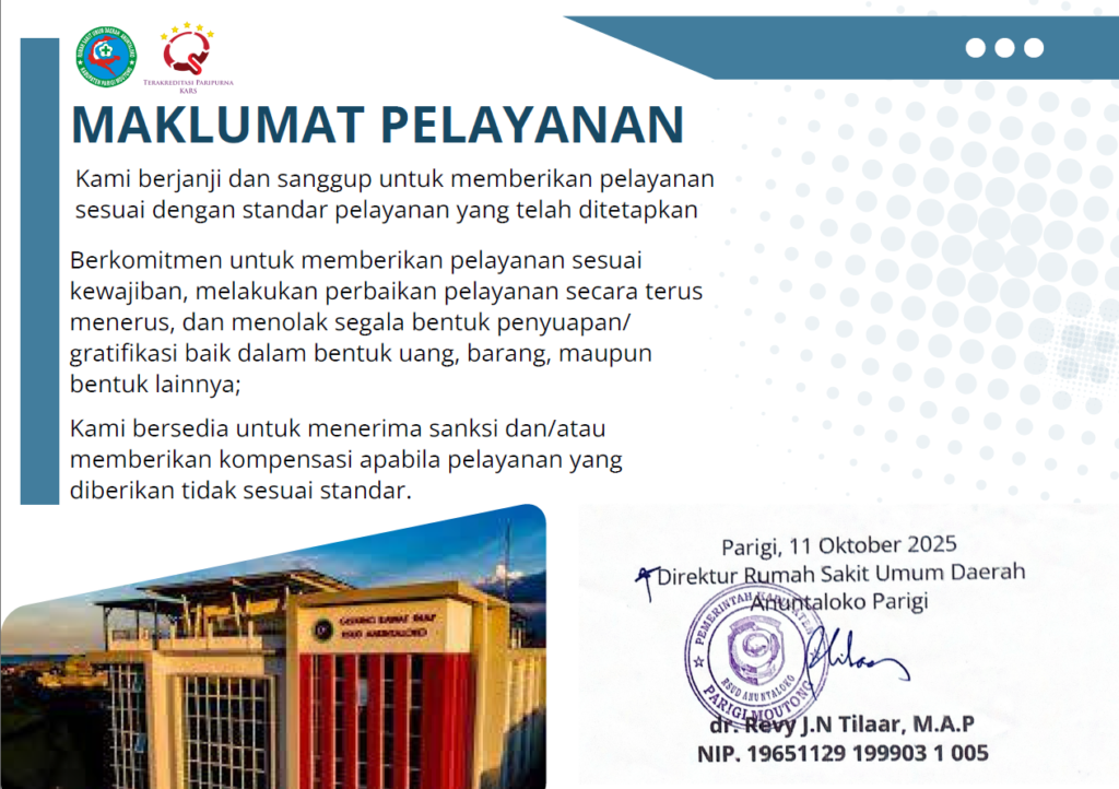 RSUD Anuntaloko Parigi berkomitmen untuk terus meningkatkan pelayanan kesehatan kepada masyarakat, menjamin akses dan mutu pelayanan kesehatan dengan terus berbenah serta mendukung setiap kebijakan pemerintah untuk menciptakan masyarakat yang sehat .