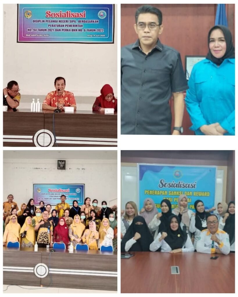 Sosialisasi penerapan sistem reward and punishment kedisiplinan pegawai di RSUD Anuntaloko Parigi sebagai bagian dari inovasi program Terampil SIKEPO. Sosialisasi ini menghadirkan narasumber dari BKPSDM Kabupaten Parigi Moutong dan diikuti oleh jajaran pegawai RSUD Anuntaloko. Kegiatan digagas oleh Hj. Hasni Djimpa, SE, selaku reformer dalam Pelatihan Kepemimpinan Administrator (PKA) Angkatan XX BPSDM Provinsi Sulawesi Tengah. (Foto : Hj Hasni Djimpa, SE)